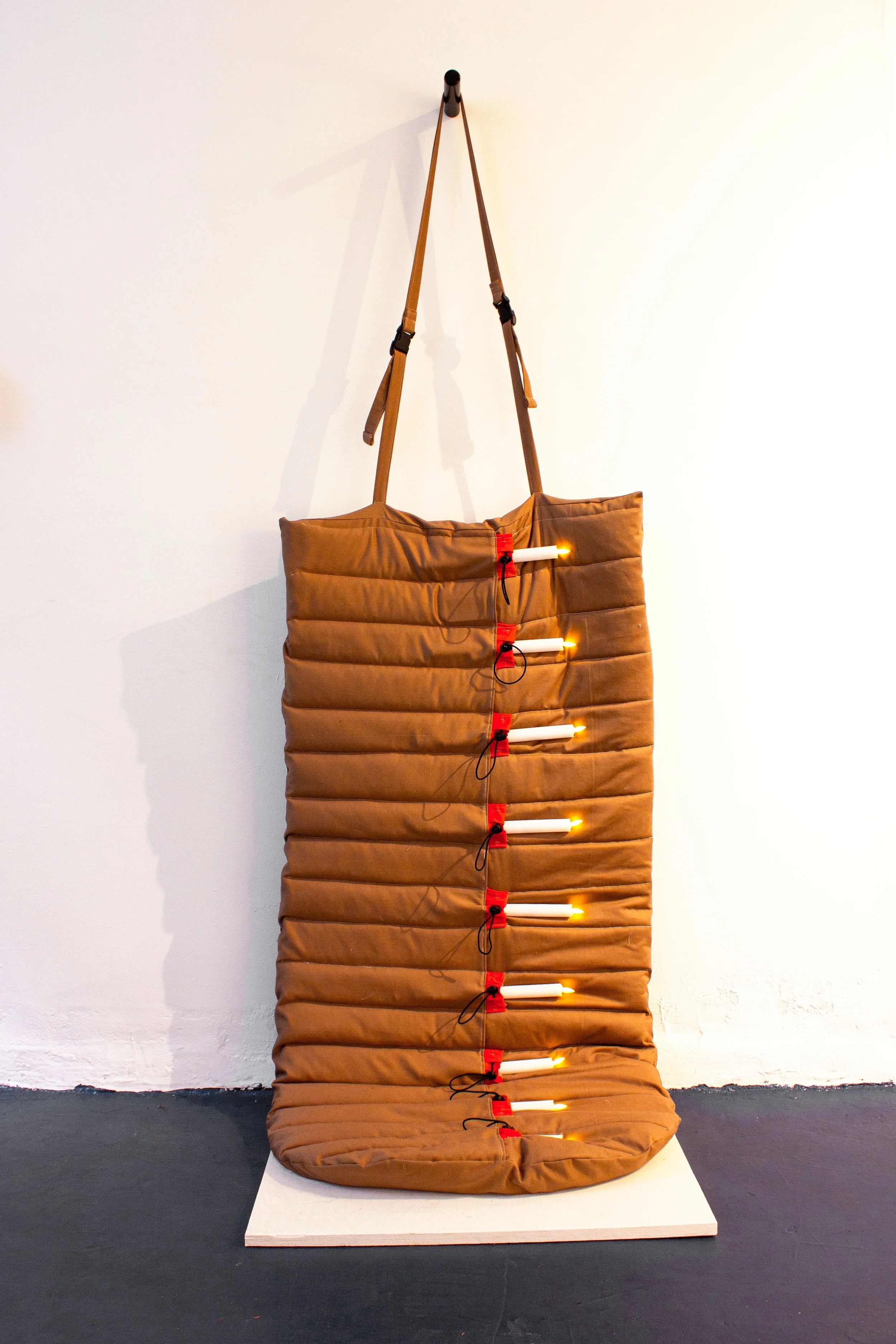 The menorah is traditionally used in the Jewish month of Kislev during the Hanukkah holiday. This work offers a different perspective on the iconic Judaica of the Jewish faith. The piece is soft and plush, designed to be carried as a bag or hung open.
